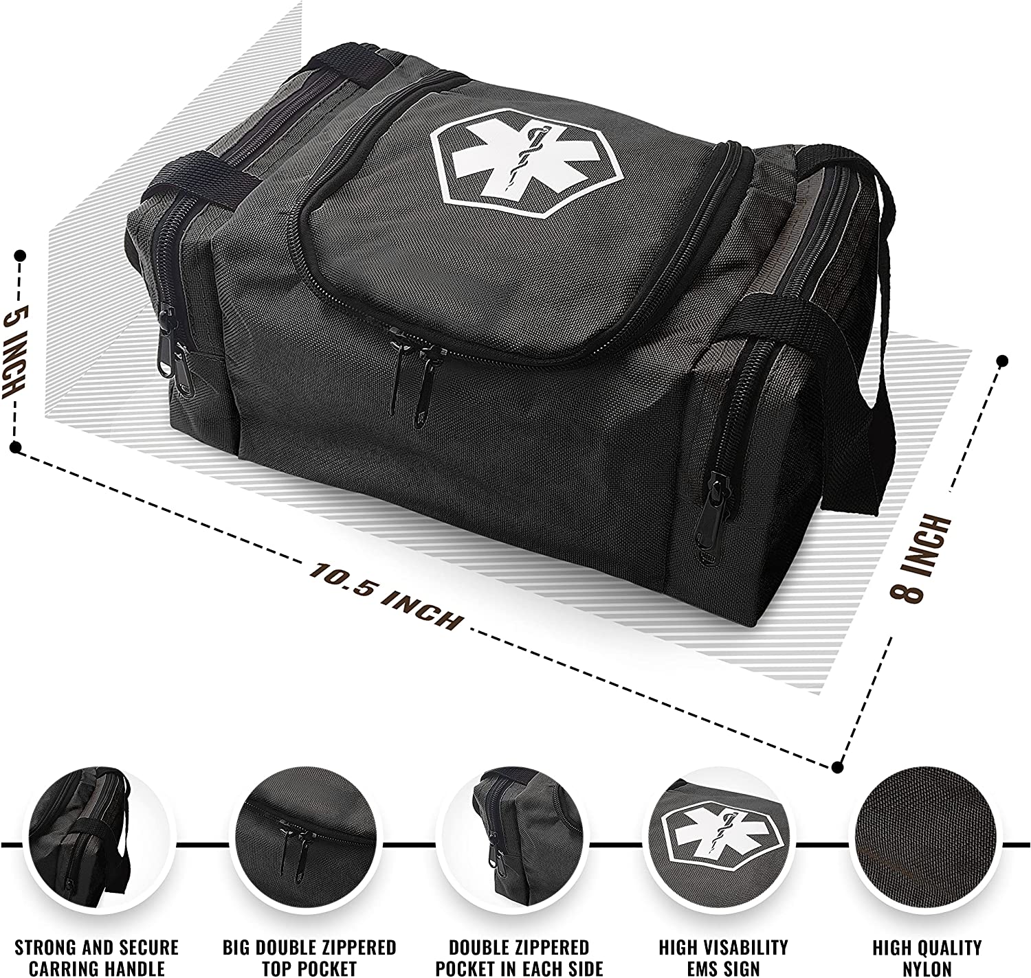 - Bolsillos de almacenamiento espaciosos: bolsillos con cremallera en ambos lados de la bolsa hacen que organizar tus suministros sea fácil y eficiente. Cremalleras de apertura rápida y suave que permiten el acceso inmediato a todos tus equipos importantes en un momento.